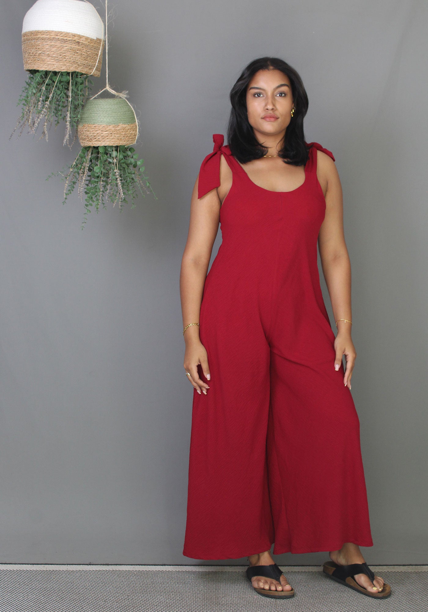 Effortlessly chic and endlessly comfortable — this wide-leg jumpsuit features adjustable tie shoulders and a reversible design. Wear it with a soft scoop neckline or a V-neckline in front. and a flowing drape for easy movement. Designed with a relaxed fit that flatters all body shapes, it’s perfect for both casual days and dressed-up evenings. Can be layered with a T-shirt for a more conservative look.
